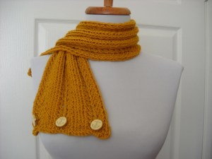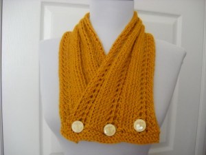 Add 3 buttons 1/2 ” from beginning row.  Button to the other end where the lace holes are or if you make it long enough you can just wrap the scarf around your neck and not use the buttons if you want.
