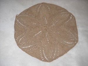 The pattern is called Botanical Medallion Cardigan from Vogue knitting magazine, Spring/Summer issue, 2009. The yarn I’m using is 70% Tanquis Cotton, 30% Linen from Knitpicks.com. The colorway is called Cashew.