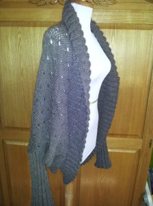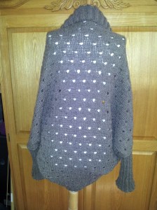 I am so happy with it! The front is very flattering for any body type. It’s comfortable and wonderful to wear on a chilly day even though mine is a little over sized. I used pattern size medium/large, but maybe should have used small/medium instead. The colorway used was Grey (Bramble Heather) by Knit Picks. 100% Peruvian Highland Wool. The pattern is from the knit 2 together book by Tracey Ullman and Mel Clark.