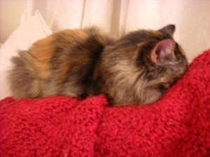 Today I’m waiting for the carpet man to arrive to replace old carpet in the office/craft room. Once that is done I can get back to work unloading boxes and then get back to work on my next knitting project. I also volunteer at an animal shelter but haven’t been able to work there either….I miss the kitties at the shelter! The one below is our kitty named Portia who is sleeping away the day.