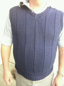 I had a problem with the length……….the pattern said to knit for 13″ from the bottom edge to the bottom of the arm opening. When I finished the vest it was a little short. Being unwilling to rip the whole thing out and start over again I decided to do a crochet edging to give the vest some length. I’m happy with the results but would have prefered to knit the body 2″ or 3″ longer instead. You will notice the bottom edge has an unusual second layer of ribbing, Ha,ha……..I never said I was perfect!