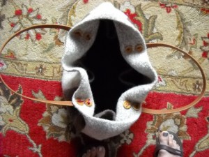 I used fisherman’s wool by Lion Brand Yarn. It felts wonderfully! Here you will see that the tote is almost finished….(looks a little strange) and of course not felted yet!