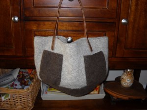 The last two pictures are the finished product, (felted!) Even my husband like the way it turned out. The handles are leather straps that are sewn on (after felting). A fairly quick knit. I used two circular needles of the same size, one for each colorway. The reason I waited so long to knit this tote is because I have a front load washing machine and was not sure if it would felt properly. To my surprize…..it felts beautifully! The tote has 8 pockets to fill with yarn stuff.