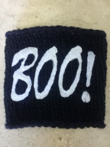 Got another Boo for you. Remember as a kid (and maybe even now) you loved to scare friends and family with a boo as they came around the corner? I certainly did and though it was so much fun…..it probably was not very nice. This cozy reminds me of just that!! Cozy is knit in black yarn and embroidered with white lettering.